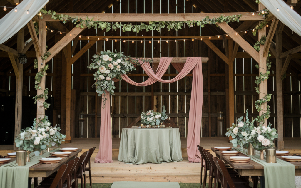 Nestled within the heart of the countryside, Rustic Elegance transforms a traditional barn into an intimate haven of soft romance. The interplay of warm wood tones, delicate drapery, and twinkling string lights evokes a fairytale-like ambiance, perfect for a love story in the making.