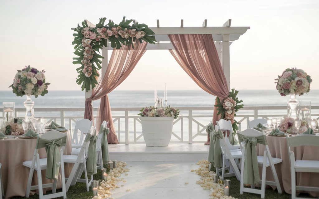 The Seaside Serenity wedding captures the ethereal beauty of an oceanfront ceremony, where the soft hues of blush, sage, and ivory blend seamlessly with the tranquil horizon. The gentle rustling of sheer drapery in the ocean breeze creates an intimate, almost poetic setting.