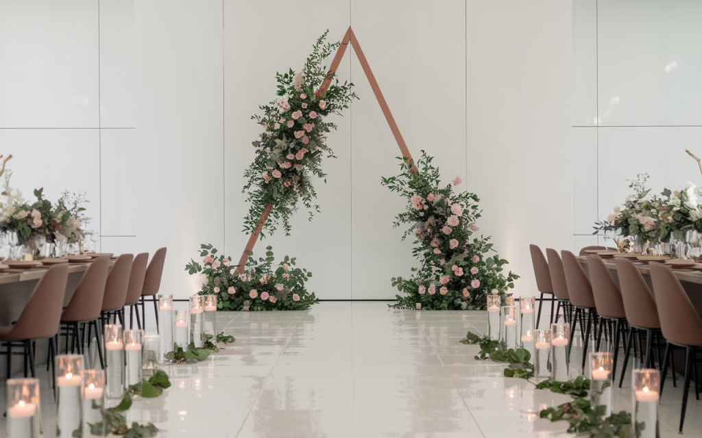 The candlelit aisle, lined with sleek glass cylinders, casts a warm flicker across the polished concrete floor. Guests are seated in modern ivory chairs, their clean lines softened by delicate greenery and muted sage napkins. At each table, blush-toned blooms spill from glass vases, mirroring the organic, undone beauty of the ceremony arch.