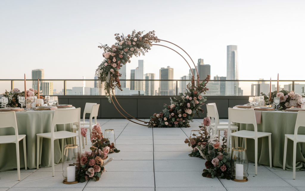 The Skyline Serenity wedding setup is where urban sophistication meets romantic charm. Suspended above the city, this rooftop celebration transforms the skyline into a breathtaking backdrop, making every vow feel like a moment suspended in time.