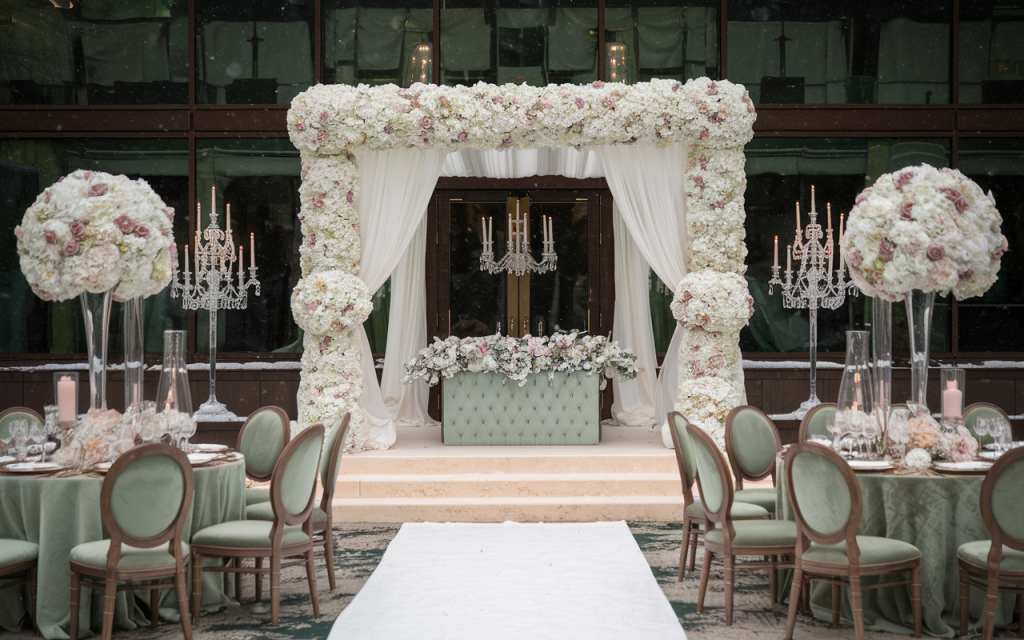 Beneath a gentle snowfall, this winter wedding unfolds like a scene from a fairy tale. A grand floral arch, crafted from ivory hydrangeas and blush-toned roses, frames the altar, its lushness contrasting beautifully against the crisp, white drapery. The softly falling snowflakes add a touch of magic, dusting the velvet-covered tables and the elegant candlelit chandeliers.