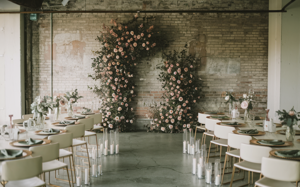 Raw, romantic, and effortlessly elegant—this Urban Whimsy wedding blends industrial charm with soft, floral beauty. Set against a textured brick wall, an asymmetrical floral installation cascades like a wild garden reclaiming the space, adding a striking contrast to the venue’s raw edges.