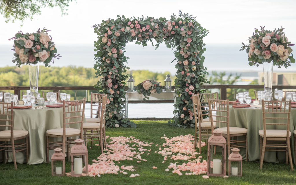 Nestled amidst lush greenery with a tranquil view of the water, this wedding exudes timeless elegance. A grand floral arch, adorned with soft blush roses and cascading eucalyptus, stands as the heart of the ceremony, framing the vows in a dreamlike setting.