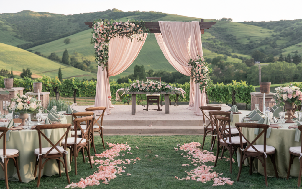 A wooden pergola, draped in soft blush fabric and adorned with cascading florals, frames the altar against a breathtaking backdrop of lush vineyards. The aisle, lined with delicate rose petals, invites guests into a scene straight from a Tuscan fairytale. Wooden cross-back chairs and sage-toned linens blend seamlessly into the organic surroundings, creating an ambiance that feels both intimate and timeless.