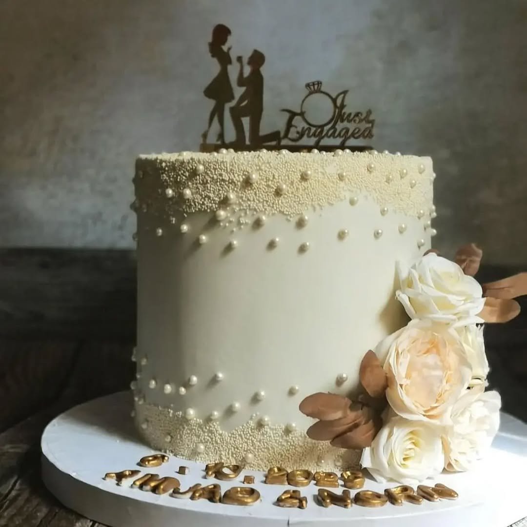 Sleek, sophisticated, and beautifully symmetrical, this pearl-adorned cake glows in its creamy white perfection. Each edible pearl has been placed with precision, creating a texture that feels both delicate and regal. The minimalist gold “Engaged” topper adds just the right amount of glimmer.