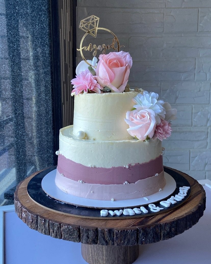 It’s minimal yet meaningful—a cake that proves elegance doesn’t need excess. Perfect for small, heartfelt engagements where the joy feels warm, real, and entirely unforgettable.