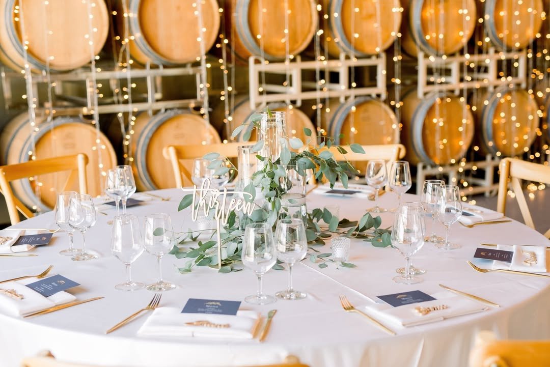 Set against wine barrels and twinkle lights, this tablescape feels straight out of a European vineyard. A loose runner of eucalyptus spills across crisp white linens, while delicate glassware and gold flatware catch the glow from above. It’s romantic in a grounded, earthy way.