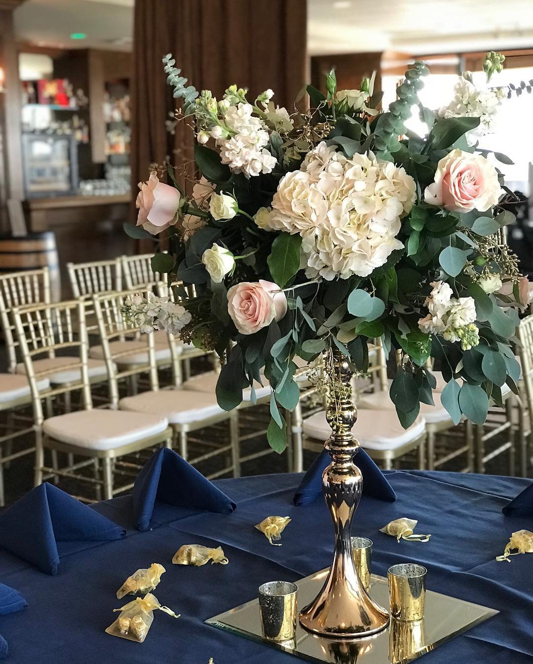 A tall gold stand overflowing with hydrangeas, roses, and eucalyptus instantly elevates the room. Paired with deep navy linens and gold accents, the whole look feels regal but still inviting. It’s giving ballroom romance with a modern twist.