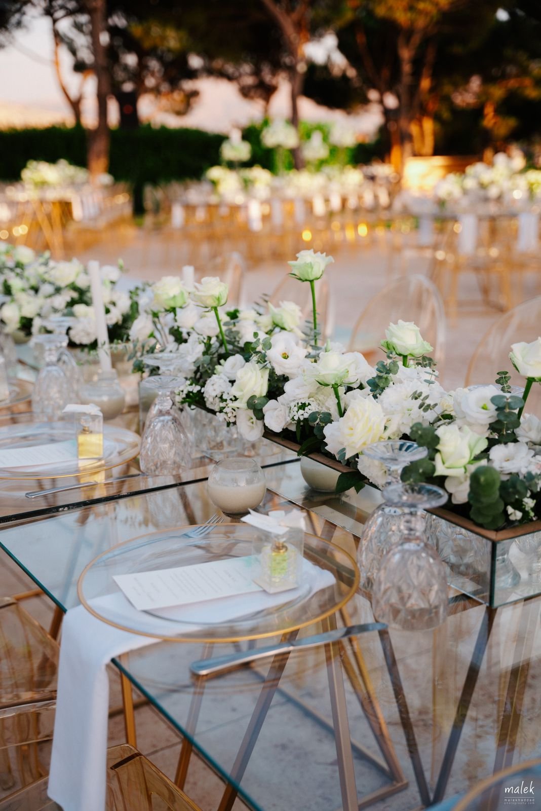 I love how the florals stay crisp and classic while the clear chairs and reflective surfaces keep everything feeling airy. It’s refined, but not stiff. A perfect balance for an outdoor evening reception where the sunset does half the decorating for you.