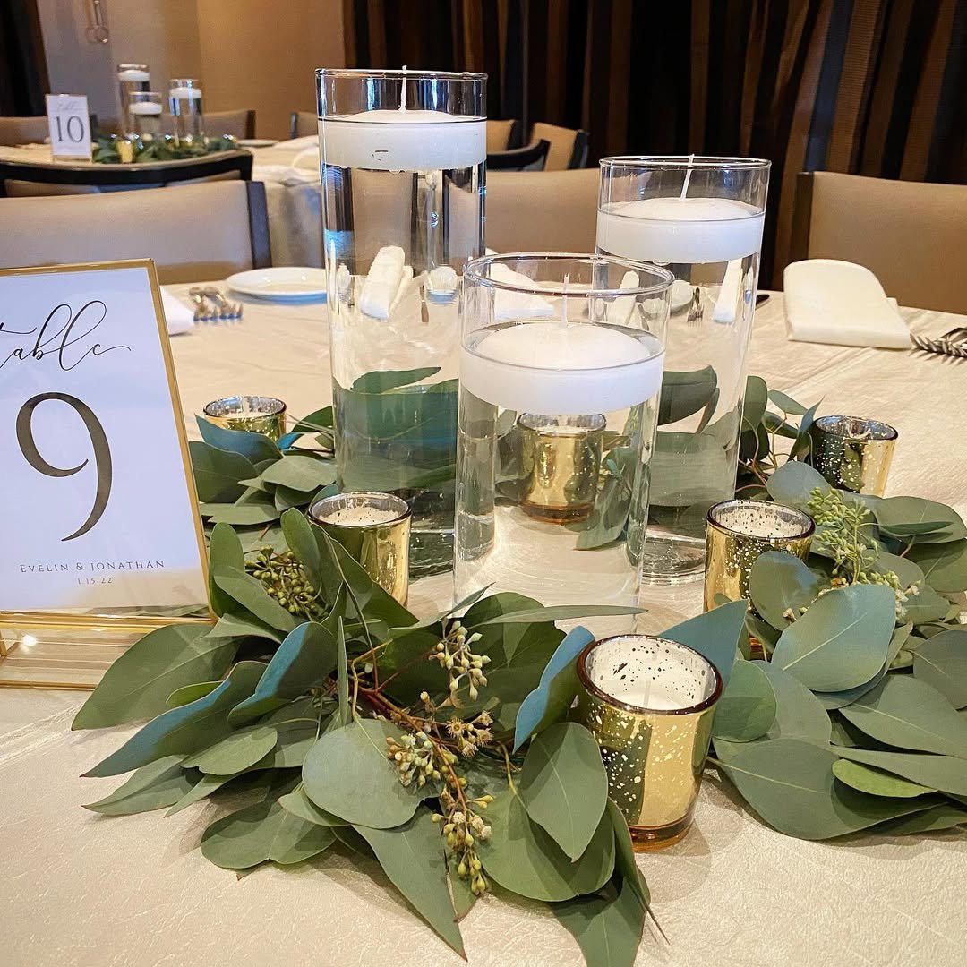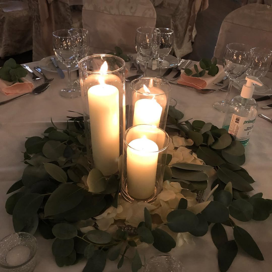 There’s something about a wreath of eucalyptus wrapped around tall glass cylinders that feels instantly intimate. The glow from the pillar candles reflects off the glass and bounces gently onto the leaves, creating that warm, almost cinematic dinner-party vibe.