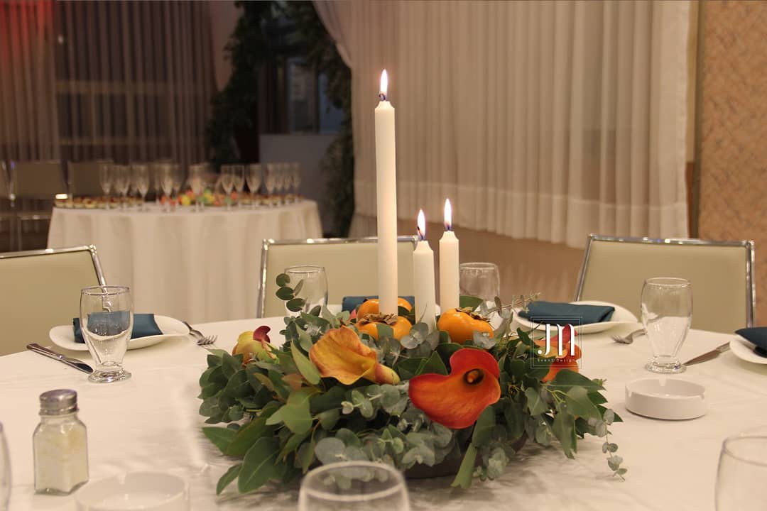 Now this is how you make a centerpiece unforgettable. Vibrant calla lilies nestled among lush greens and bright citrus create a bold, seasonal look that still feels curated. The trio of taper candles rising from the center adds structure and height, grounding all that color.