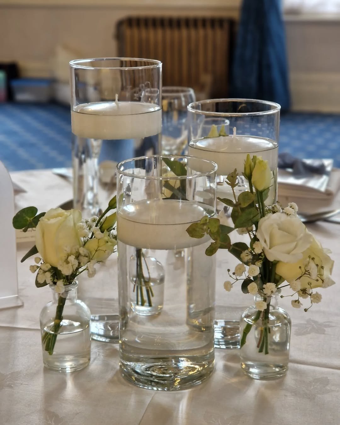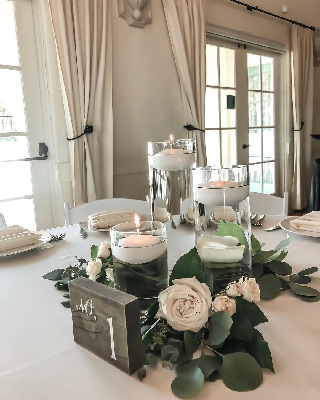 Clustered cylinder vases with floating candles create an effortless focal point, especially when paired with petite bud vases of white roses and baby’s breath. It’s clean, fresh, and quietly luxe.
