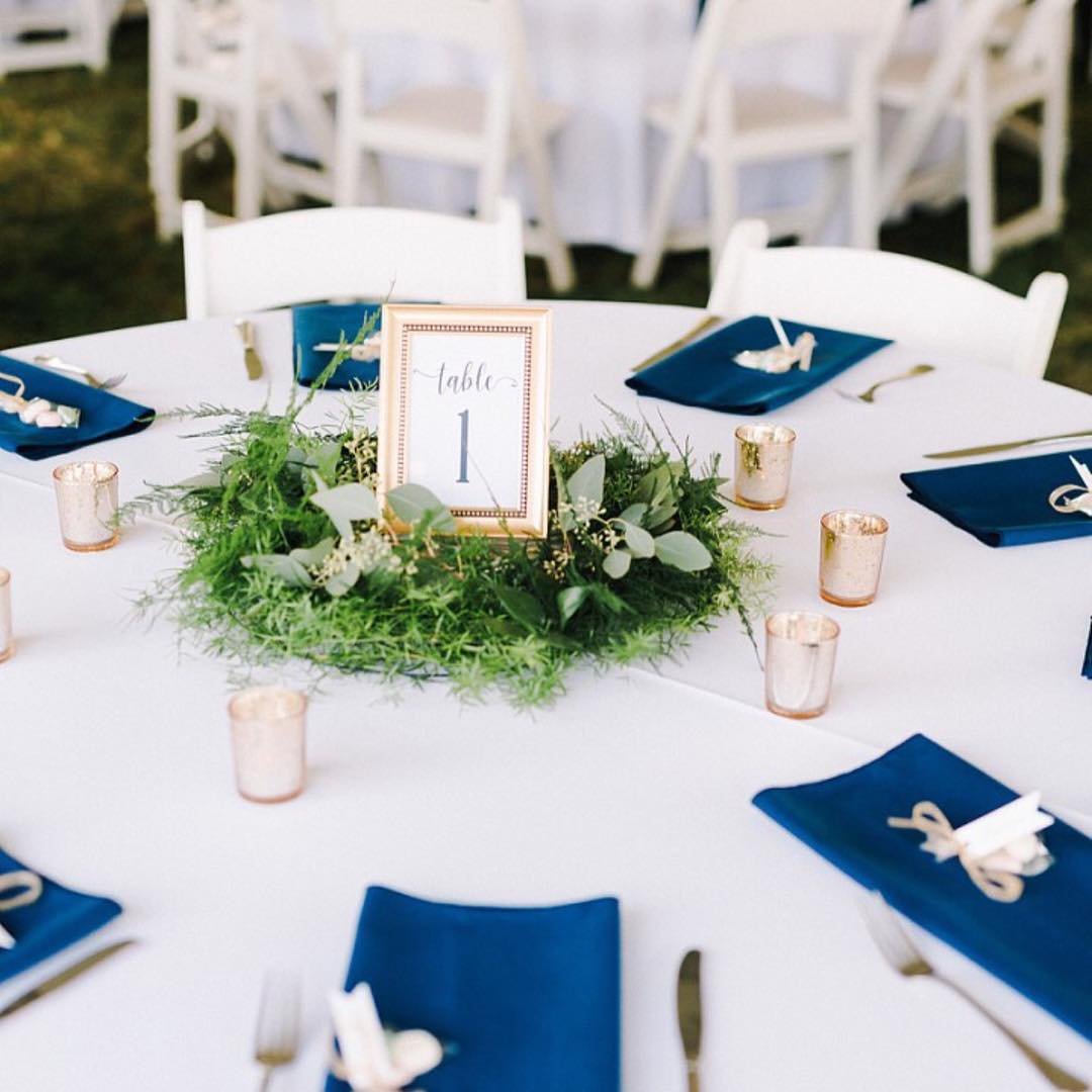 A lush ring of mixed greens frames a delicate table number, creating a centerpiece that feels both structured and relaxed. Paired with navy napkins and gold accents, it strikes that sweet spot between classic and contemporary.