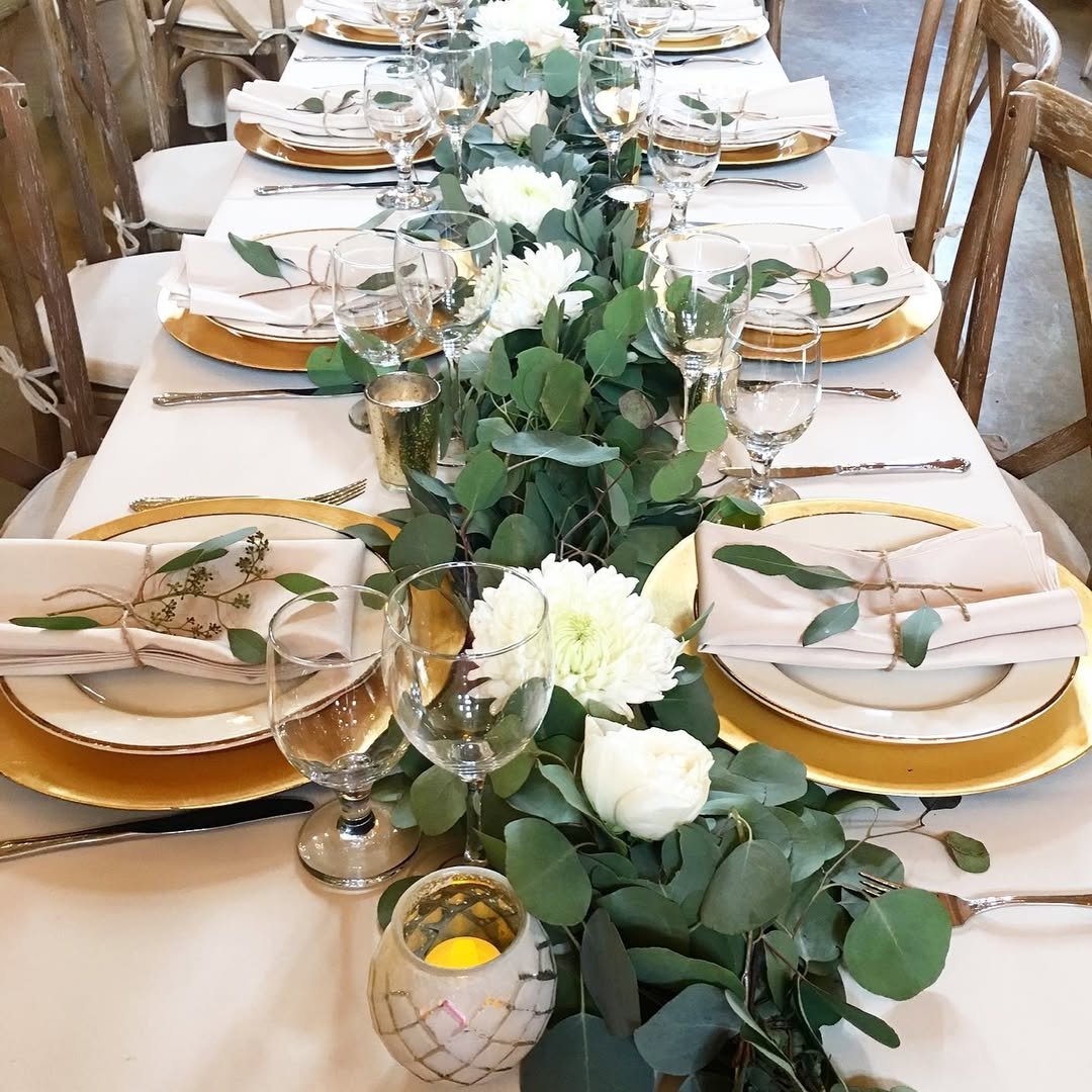 Long tables dressed with gold chargers, soft ivory linens, and a thick eucalyptus runner feel timeless in the best way. White blooms peek through the greenery, while candlelight reflects off glassware for that warm, celebratory glow.