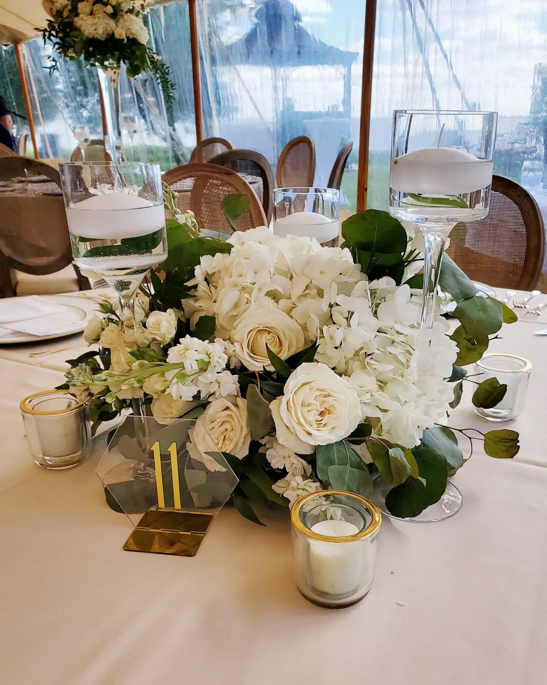 Creamy hydrangeas, pale roses, and glossy eucalyptus leaves come together in a full, abundant arrangement. Paired with floating candles in tall stemmed glass holders, it feels polished yet inviting.