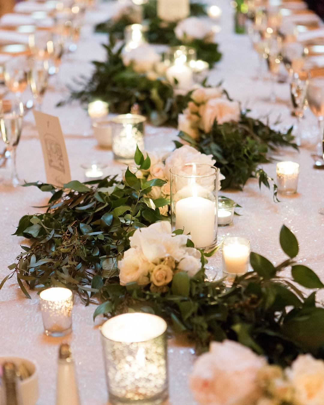 This is proof that you don’t need towering arrangements to make an impact. Lean into texture, mix leafy sprigs with delicate fillers, and let candlelight create the romance.