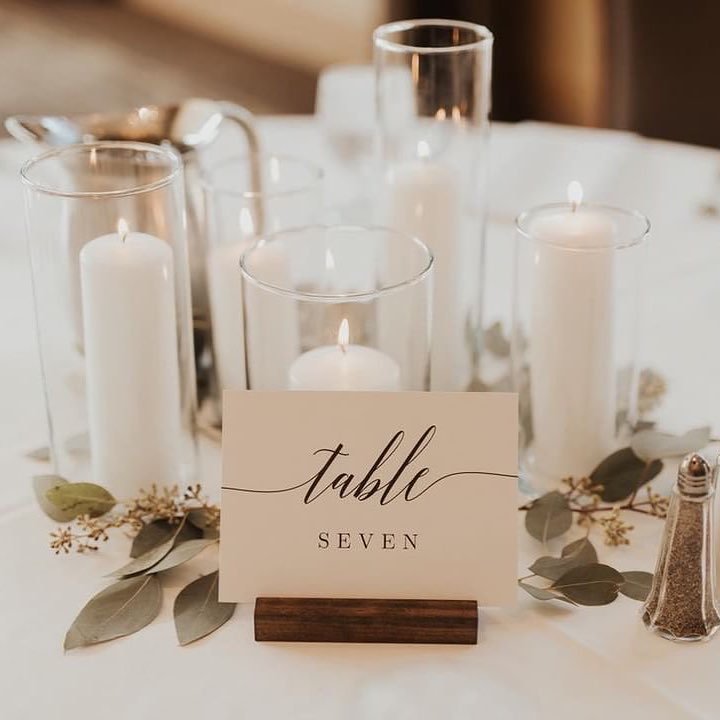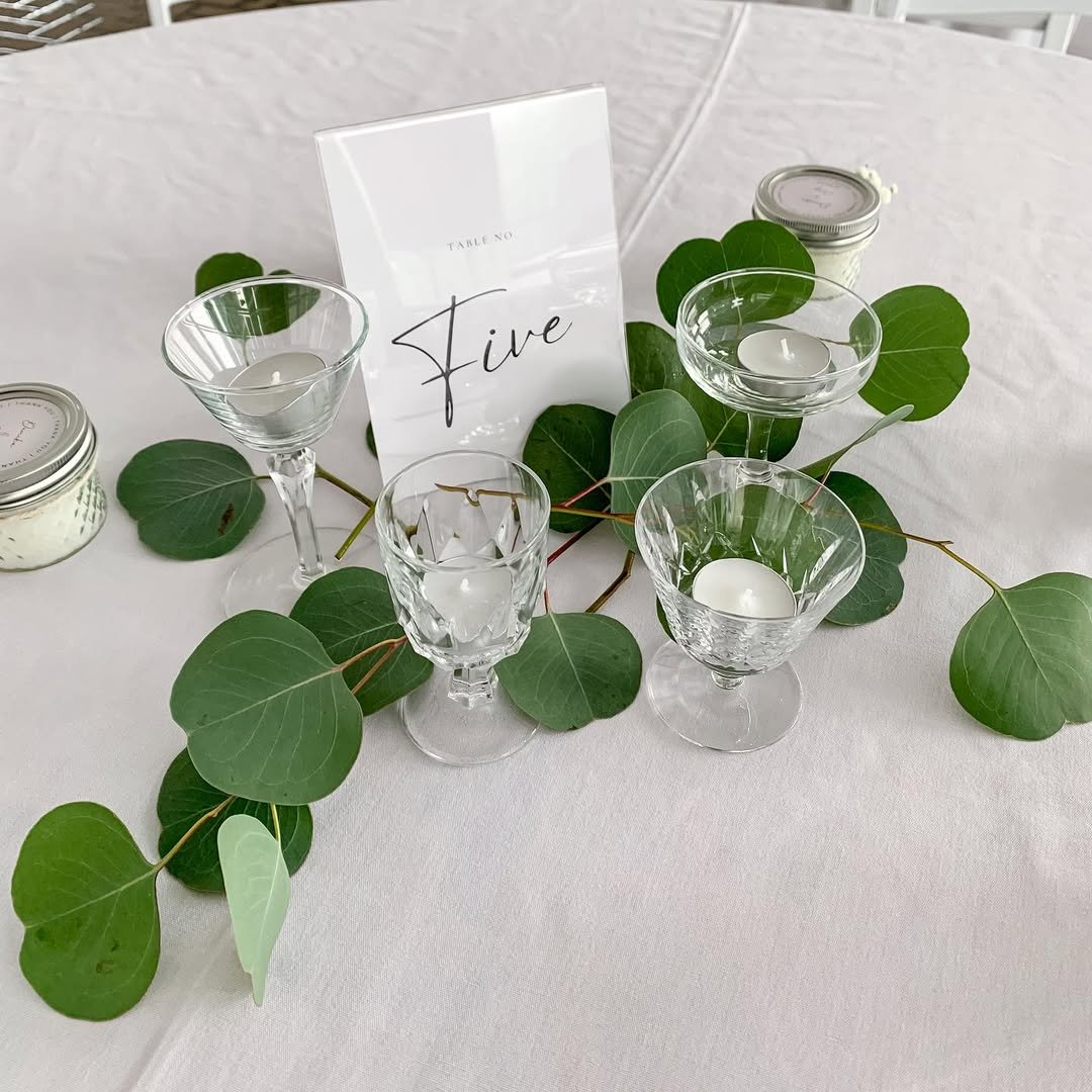 A crisp acrylic table number surrounded by loose eucalyptus stems and petite candle holders feels fresh and contemporary. The greenery frames the display without overpowering it.