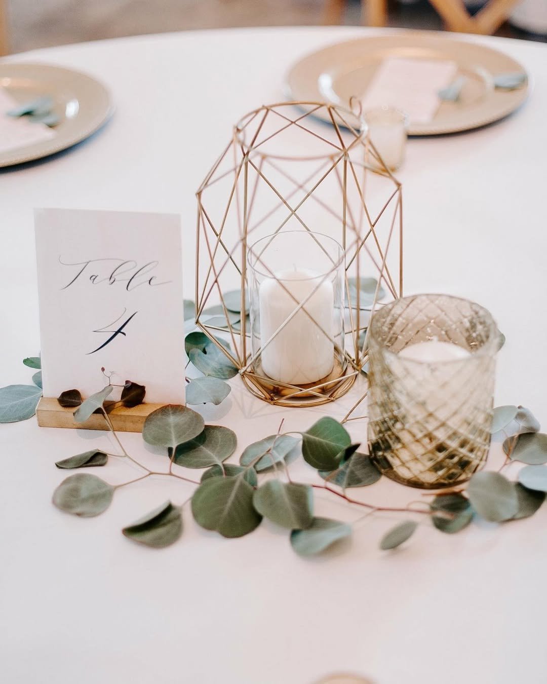 A geometric gold lantern, scattered eucalyptus leaves, and a simple white candle come together in the most understated way. It is minimal, but not cold. The clean table number and soft greenery keep everything feeling airy and thoughtful.