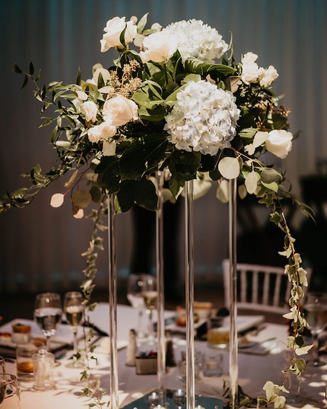 This one feels like it belongs at an evening reception where the lighting is soft and everyone lingers a little longer. Cream roses and full hydrangeas rest on sleek acrylic stands, while greenery drapes down in the most effortless way. It has that candlelit ballroom energy, intimate but elevated.