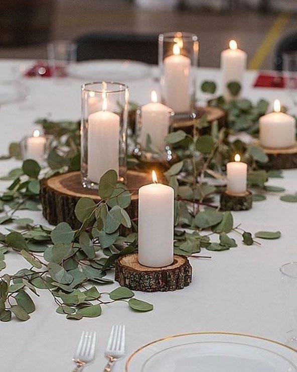 Wood slices topped with pillar candles bring that organic, woodland charm straight to the table. Eucalyptus trails between each candle, softening the look and adding movement. It feels cozy, like a reception that flows from golden hour into a night under string lights.