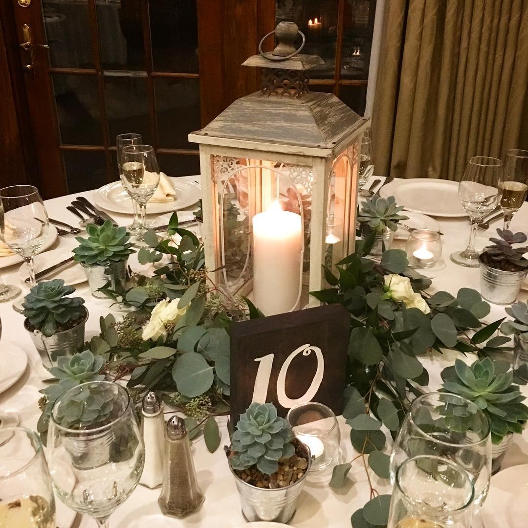 A vintage-style lantern takes center stage, glowing softly from within, while eucalyptus garlands and small succulents circle the base. It’s rustic, cozy, and just a little bit nostalgic.