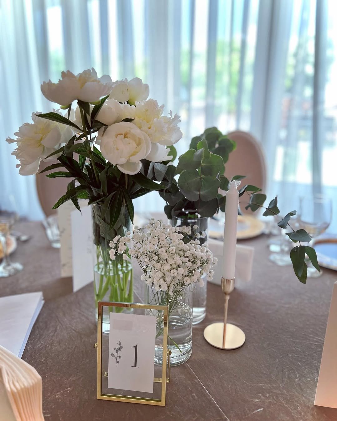 Fresh peonies, baby’s breath, and eucalyptus in clear glass vases give this table an effortless, daylight charm. It feels like a spring brunch where the prosecco is flowing and the conversation is easy. The gold frame detail on the table number adds a subtle polish without overpowering the florals.