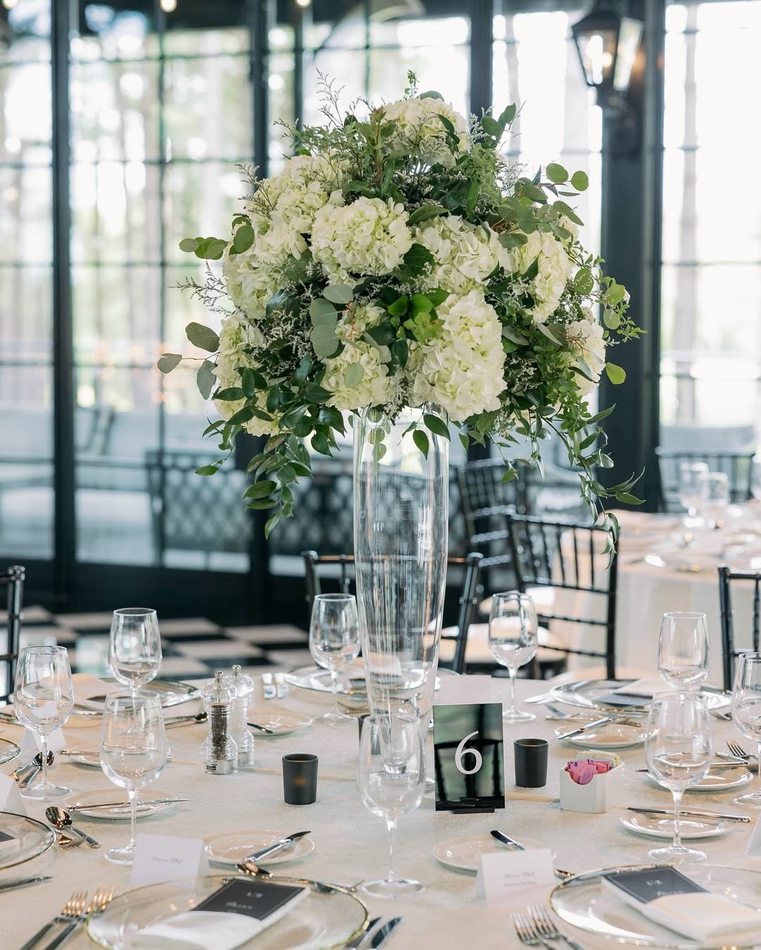 There is something about an all-white arrangement that instantly quiets a room in the best way. Towering hydrangeas and soft ivory roses rise from a slender glass vase, surrounded by eucalyptus that spills just enough to feel organic. Against those black-framed windows and crisp place settings, the whole scene feels like a modern estate dinner, refined yet welcoming.