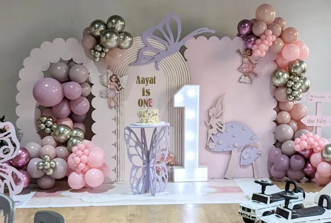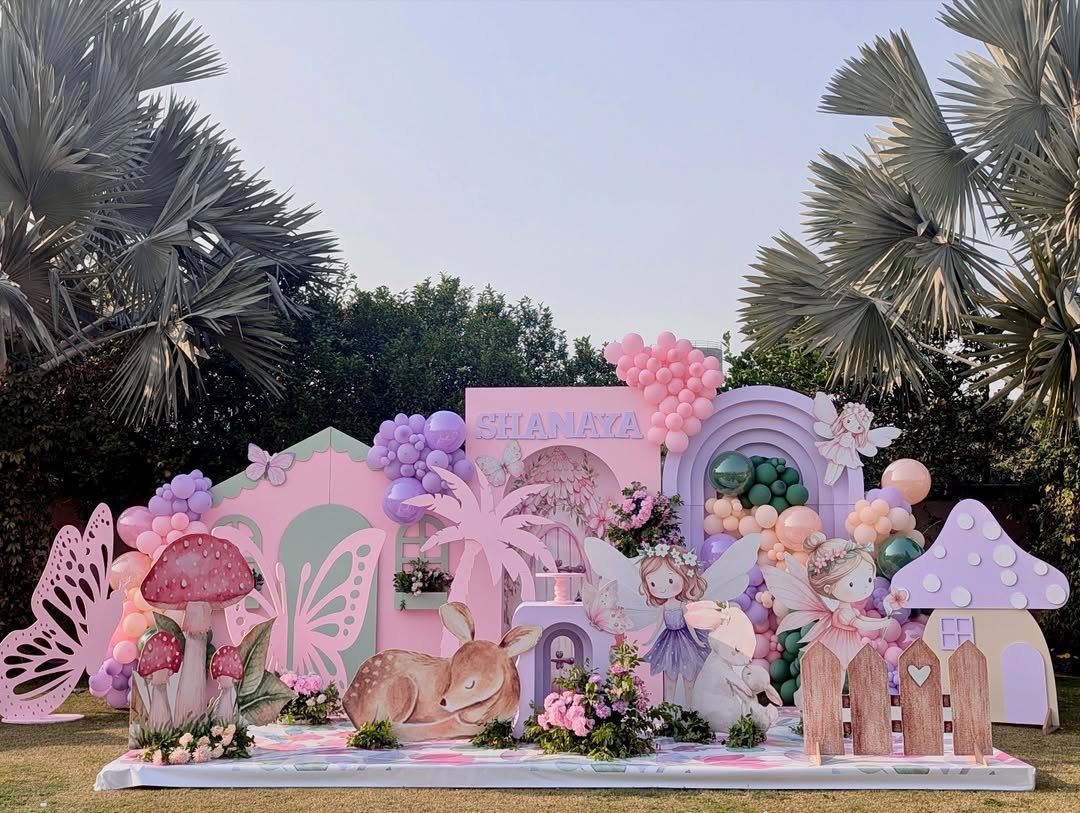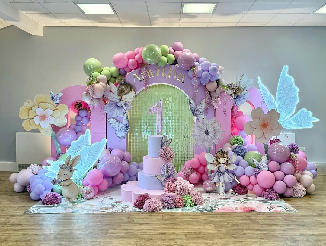 Now this one is pure celebration energy. The full stage setup, glowing fairy wings, and layers of pink balloon garlands instantly make the space feel like a magical performance is about to begin. It’s dramatic in the best way, especially with the castle-like fairy house and sparkling backdrop.