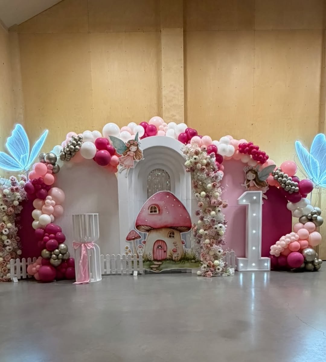 If fairytales had a grand entrance, this would be it. Soft pink arches, clusters of white and raspberry balloons, and sparkling metallic accents create a backdrop that feels both magical and celebratory. The mushroom house in the center acts like the heart of the scene, instantly pulling you into that whimsical fairy world.