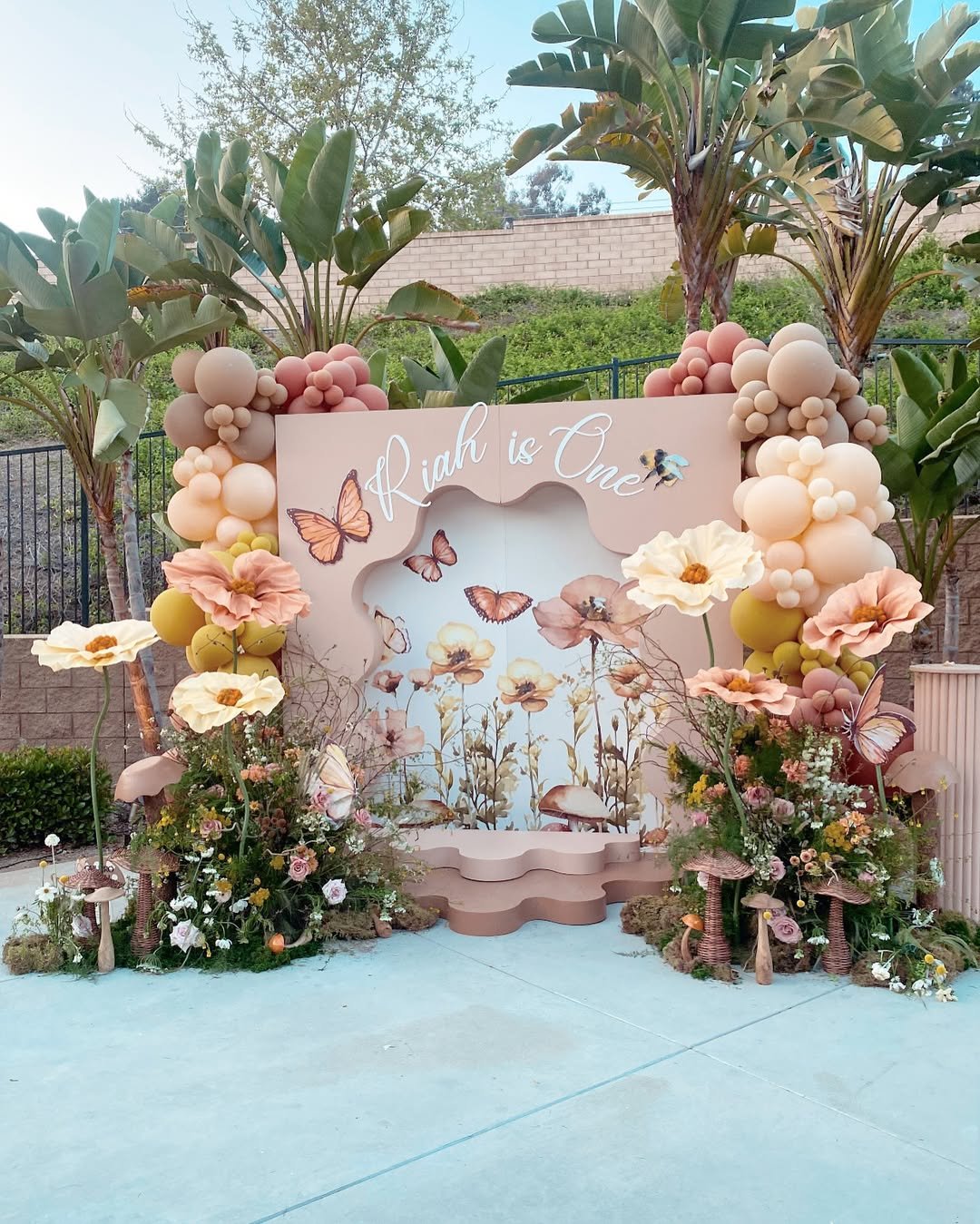 What really makes this design charming are the layered details. Butterflies perch lightly on the balloons, delicate florals cascade down the garlands, and those whimsical mushroom props bring in that playful fantasy element. It’s the kind of birthday backdrop that feels both dreamy and joyful, perfect for those first birthday photos that parents will treasure forever.