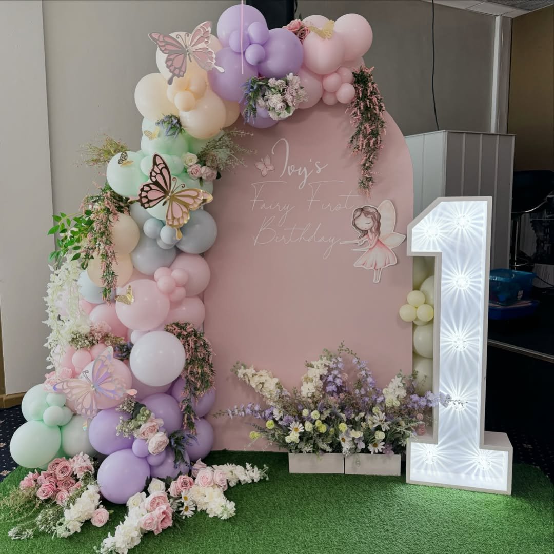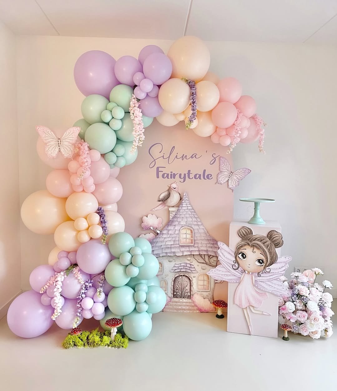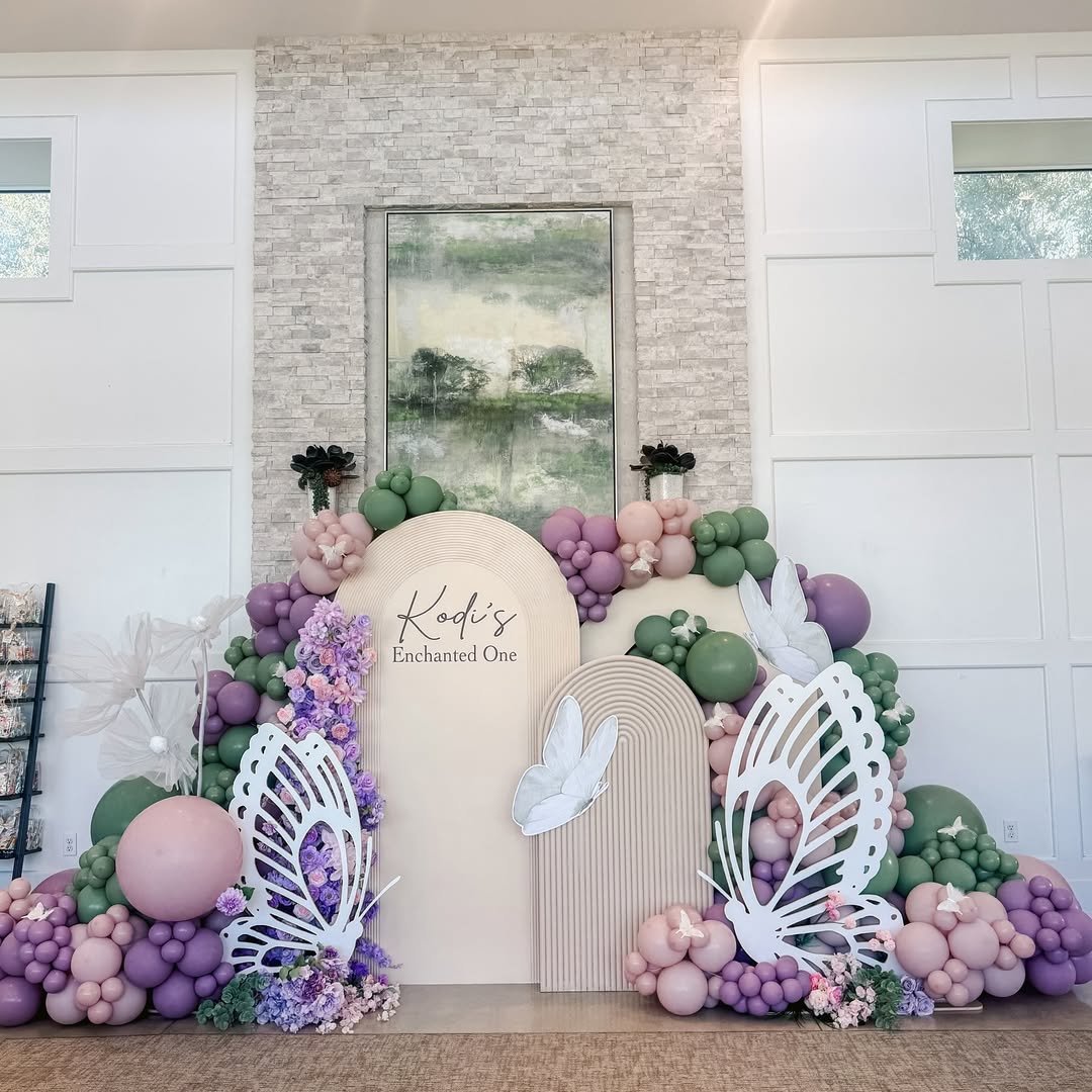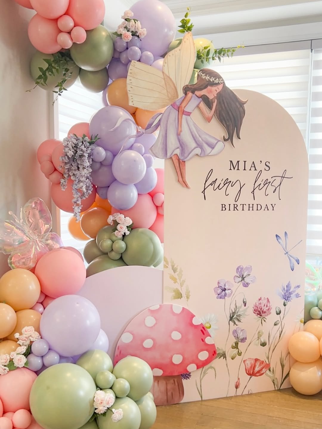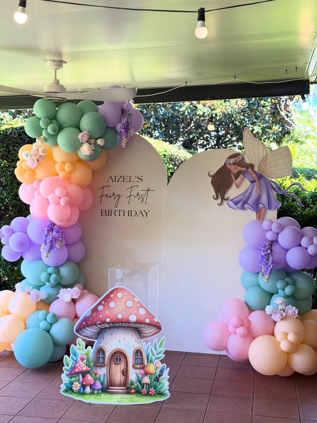 There’s something instantly charming about this setup. The soft lavender, peach, and sage balloons feel like they’ve been gathered from a quiet garden in spring, wrapping around the backdrop in that loose, organic way that always looks effortless but never accidental. The fairy perched above the sign gives it a dreamy storybook moment, almost like she’s watching over the celebration.