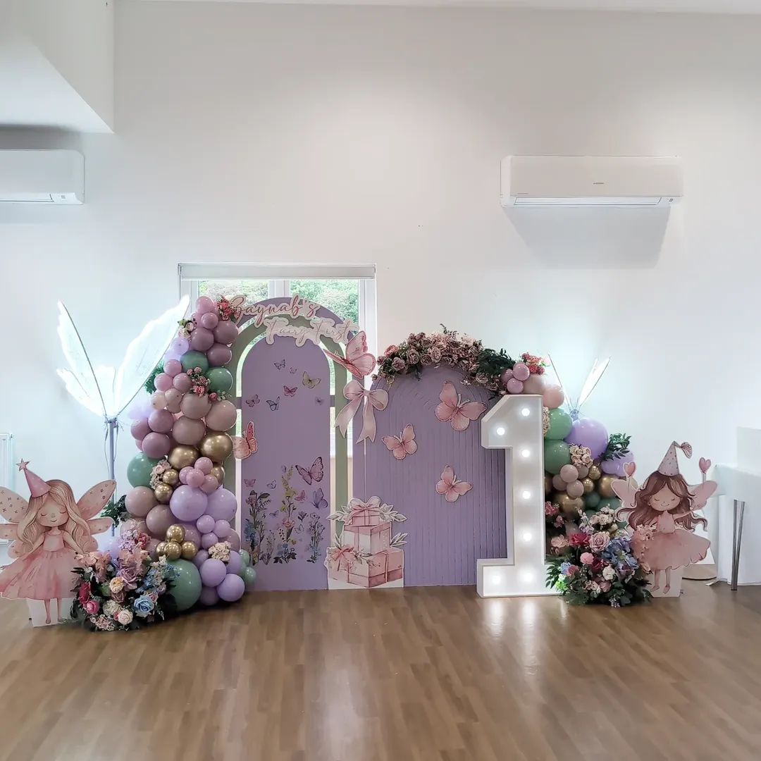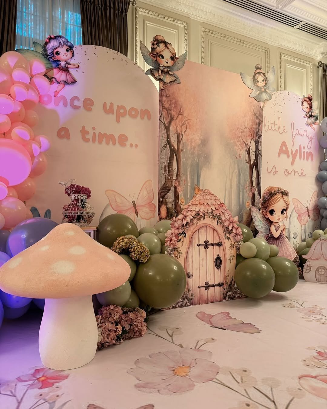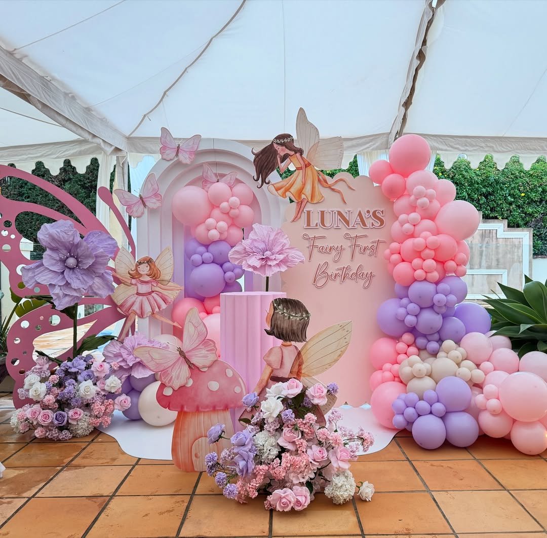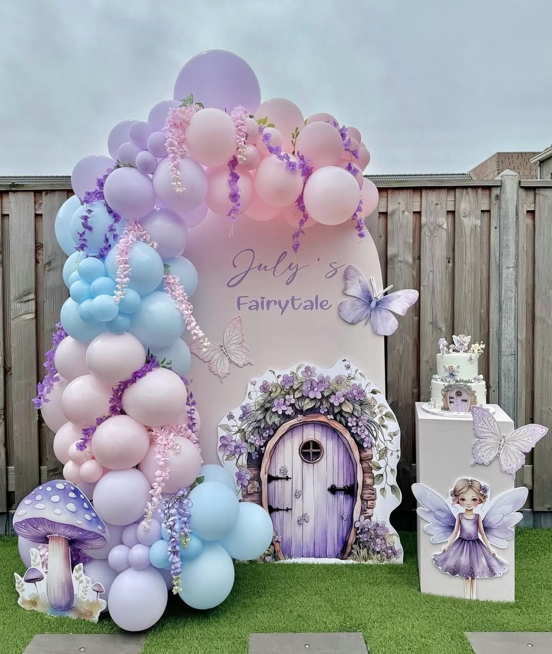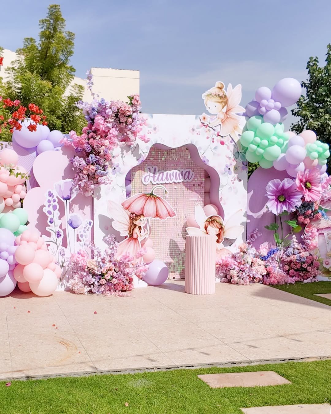 This one leans straight into storybook magic. Soft pink and lavender balloons climb across the backdrop while fairy illustrations and oversized flowers create a little enchanted world. It almost feels like the fairies are hosting the party themselves.