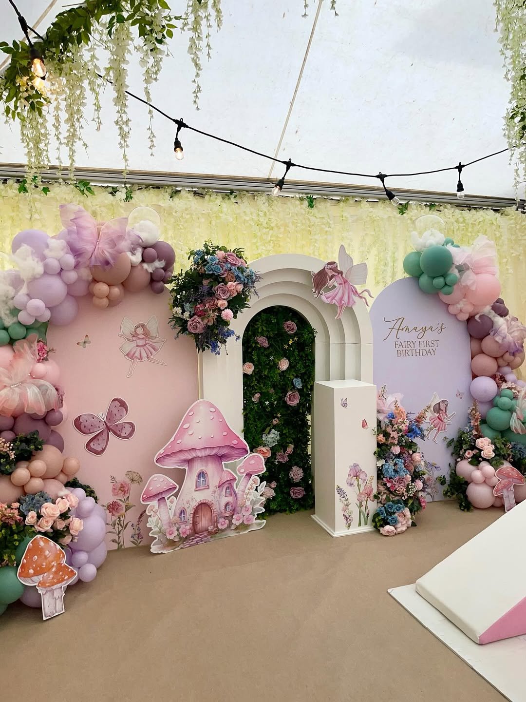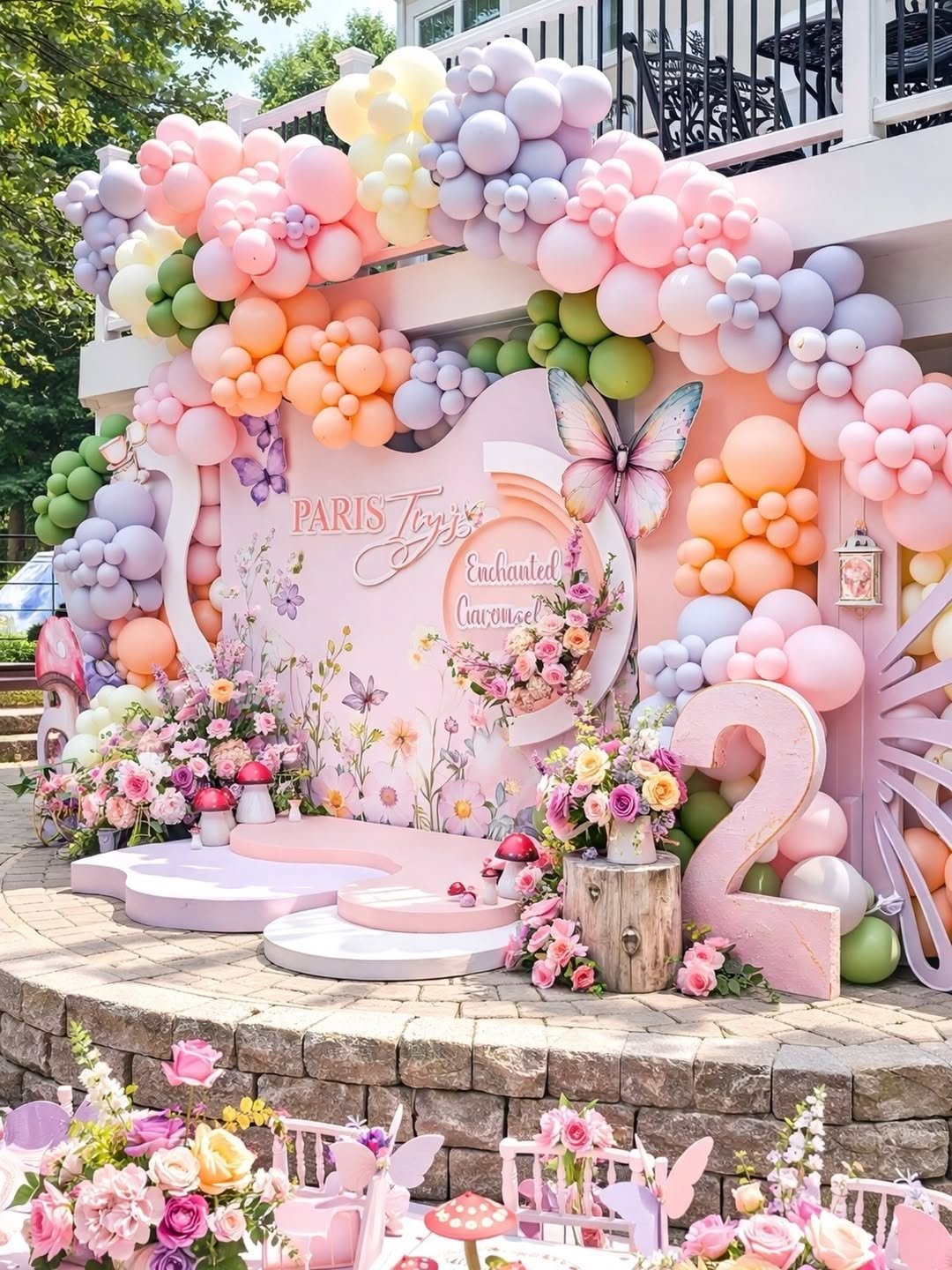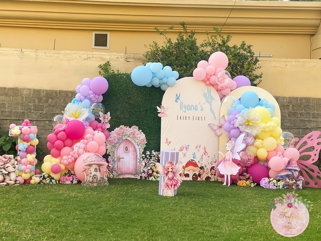 This one feels like stepping straight into a tiny enchanted forest. Bright pastel balloons bloom across the lawn, and that little pink fairy door tucked into the greenery almost looks like it might open if you knock. The playful colors bring energy, but the floral details soften everything so the setup still feels dreamy.