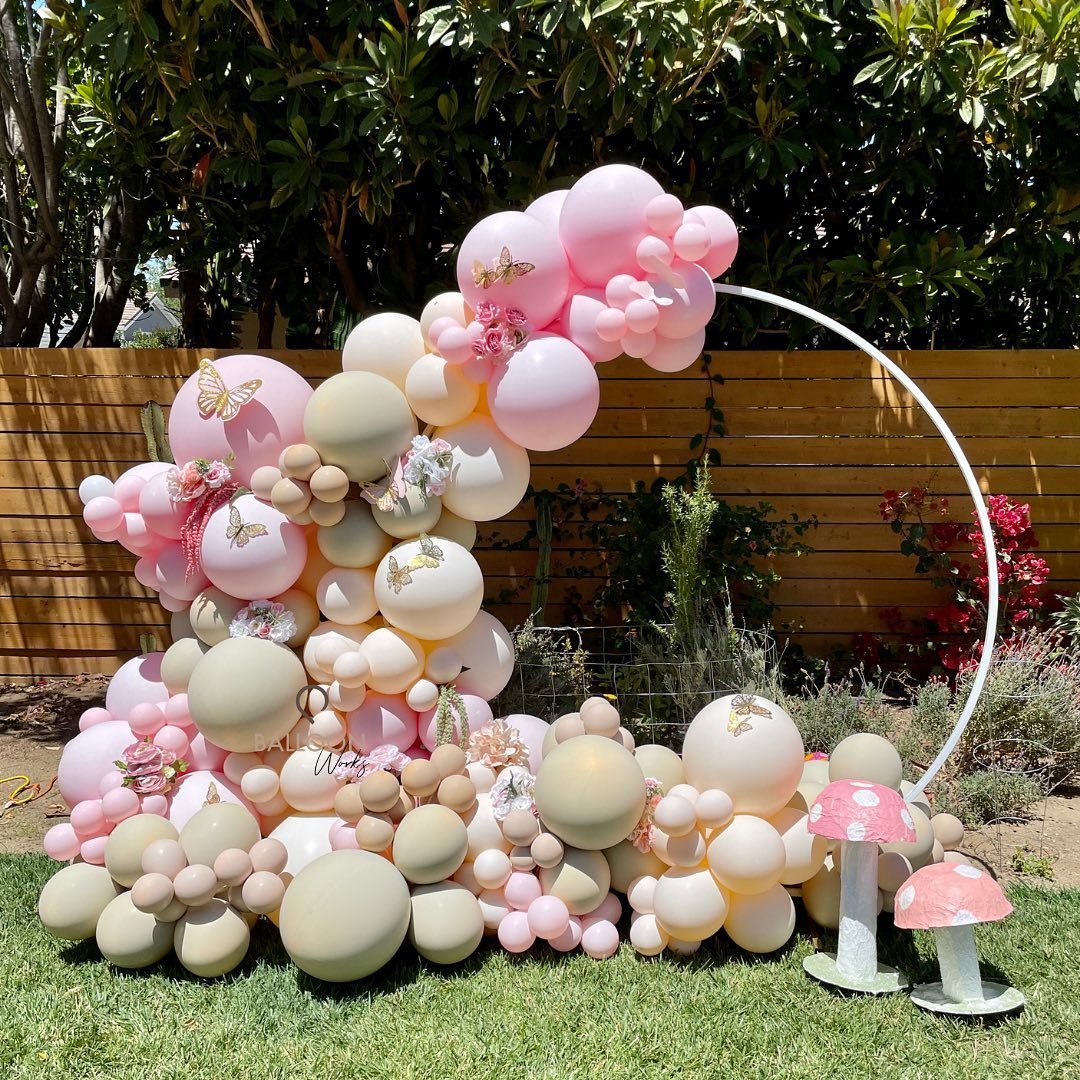 Sometimes the simplest setups end up being the most elegant. This circular arch design wrapped in soft pink, cream, and blush balloons feels airy and romantic, almost like a fairy garden floating in the sunshine. The neutral tones make it incredibly versatile while still keeping that soft magical vibe.