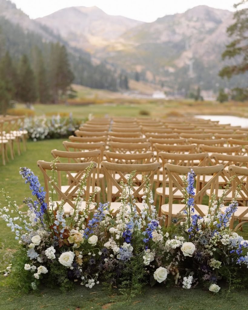 Framed by the majestic curve of the mountains, this open-air aisle leans into organic elegance. Natural wood chairs echo the warmth of the earth, while wildflower-inspired blooms in inky blues, snowy whites, and pale lavender spill like a painter’s brushstroke along the grass. It’s soft, untouched beauty—equal parts serene and breathtaking.