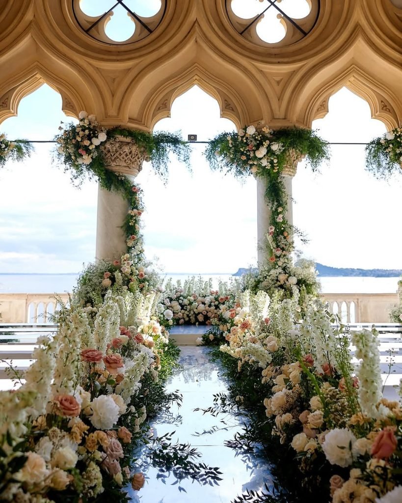 With every step along the mirrored pathway, delicate cream and blush blooms rise like a floral tide—lush, unstructured, and impossibly romantic. The Gothic revival columns, wrapped in trailing greenery and crowned with blooms, frame the sparkling sea beyond, as if the architecture itself is leaning into the celebration.