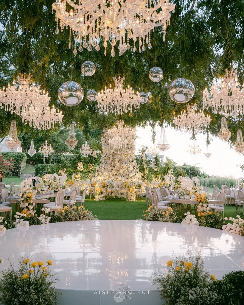 The glossy white dance floor reflects it all—chandeliers, blossoms, and the hush of golden hour—turning the moment into something cinematic. It’s opulence with a soul, a garden celebration dipped in crystal light.