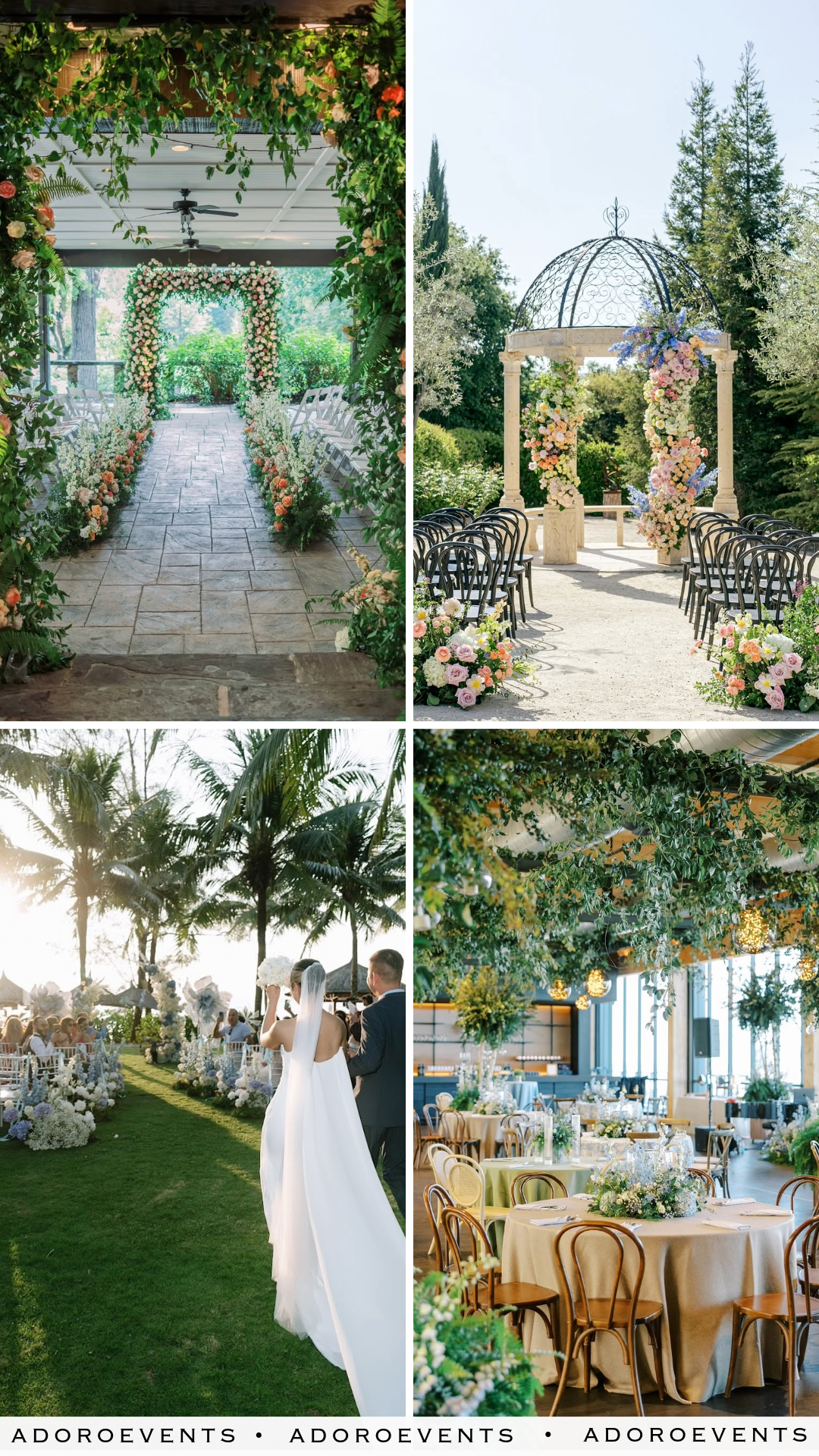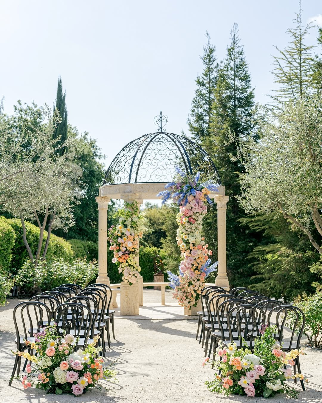 Set beneath a wrought-iron dome and framed by cascading pastel florals, this ceremony spot feels like it was plucked from a secret garden in Provence. Soft coral, blush, and periwinkle blooms climb each column like they’re reaching toward a storybook ending.