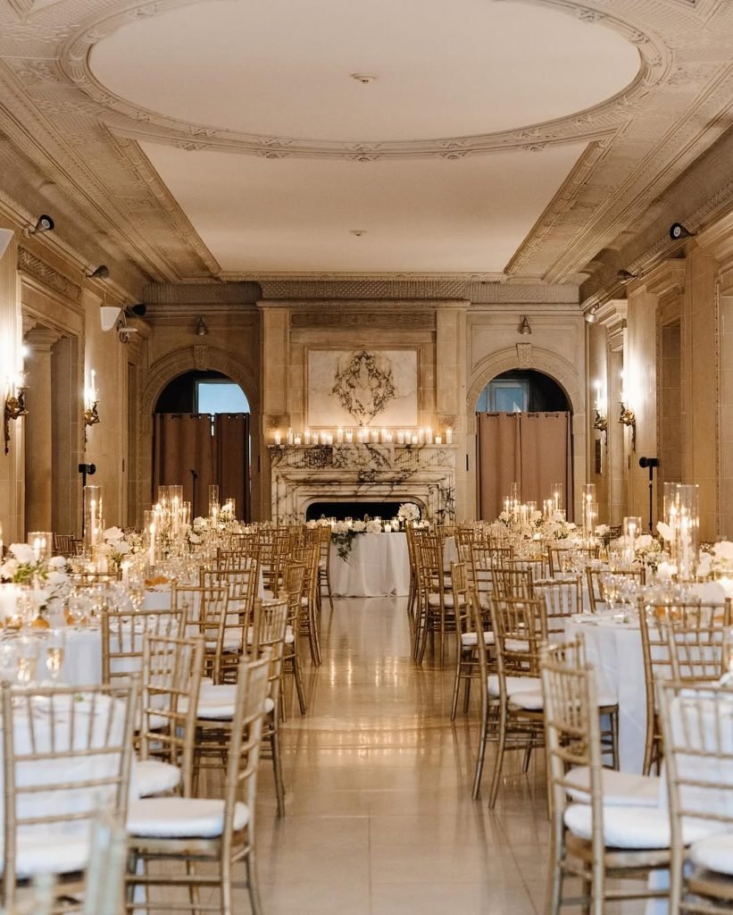 Creamy stone walls and intricate molding set a tone of restrained opulence, while tall taper candles flicker like poetry down every table. The gilded chiavari chairs add a soft glint, harmonizing with delicate ivory florals that echo the quiet luxury of the space. At the room’s heart, a grand marble fireplace crowned with candlelight creates a cinematic focal point—both stately and intimate.