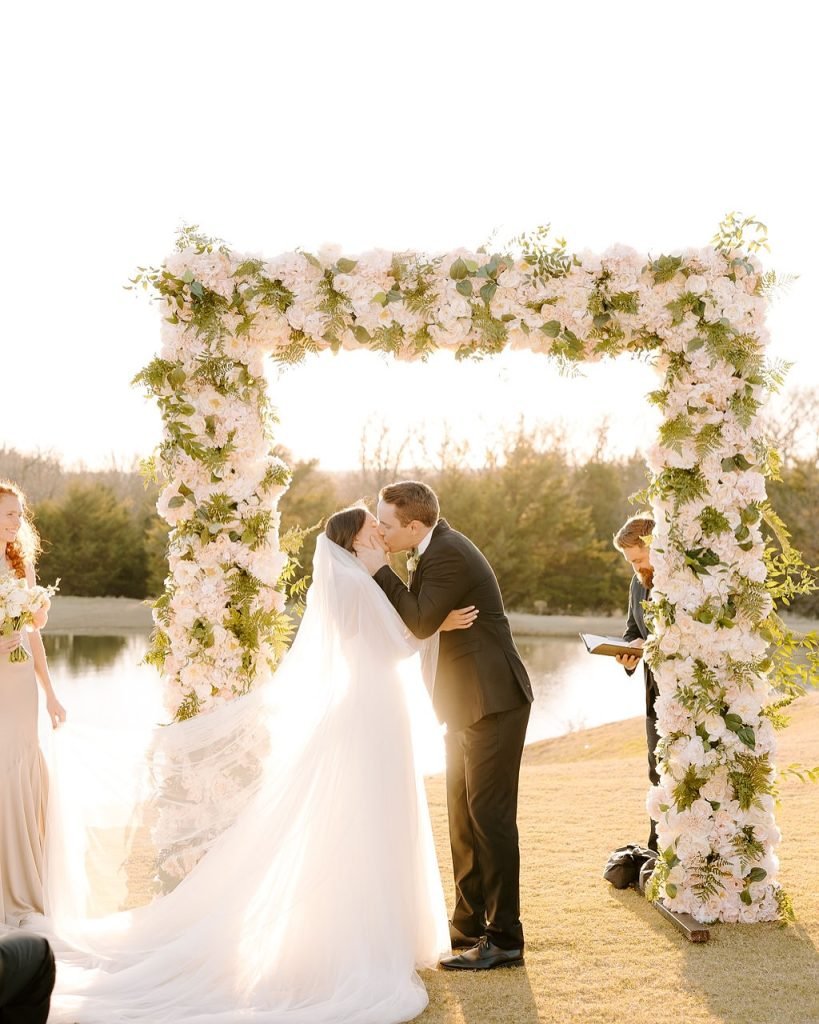The structure is wrapped entirely in cascading blush blooms and delicate greenery, creating a lush floral frame that glows against the late-afternoon light. There’s something cinematic about the way the bride’s veil catches the golden rays—like nature itself paused to witness the kiss.