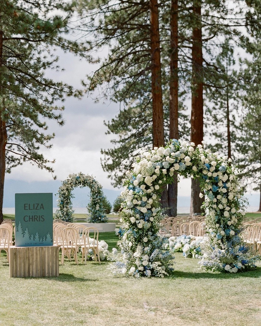 Surrounded by towering evergreens and whispering mountain breezes, this ceremony feels like it belongs in a woodland fairytale. The soft blue and white florals cascading over twin arches add a sense of gentle magic—like the forest itself was invited to the celebration.