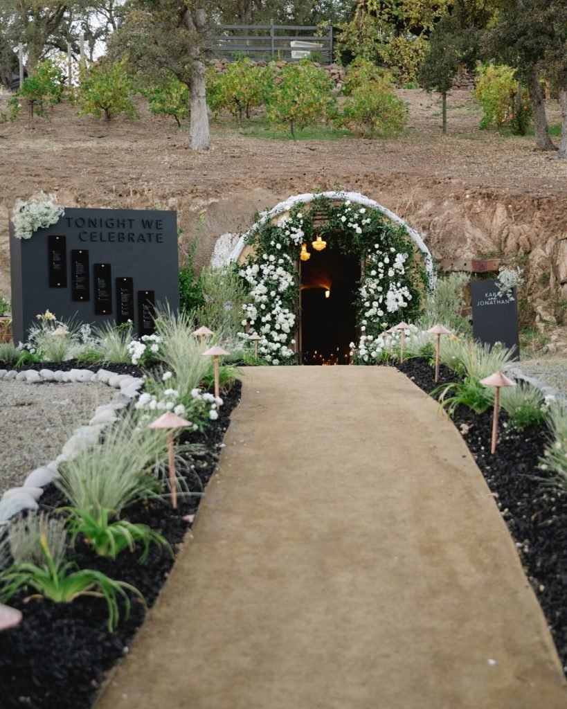 Creamy white blooms spill around the arched entry like a portal into another world, while soft amber lights flicker within, inviting guests to step into celebration. The path is lined with blush-toned mushroom lights and textured greenery, grounding the look in whimsy and woodland fantasy.