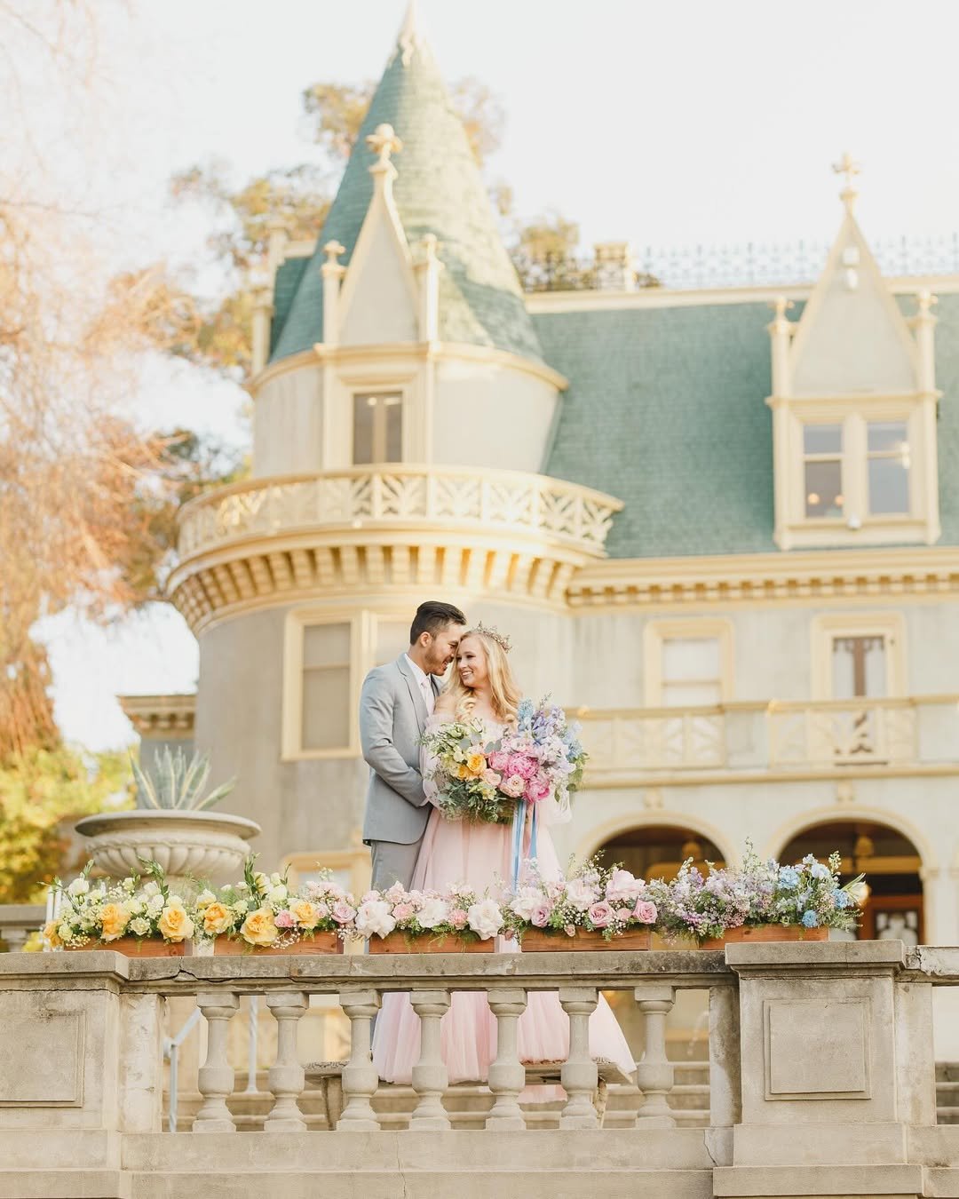 If I’ve ever seen a real-life fairytale, it’s this one—complete with a dreamy turreted castle, a pastel bouquet fit for a princess, and two people glowing with storybook romance. You can almost hear the harp playing in the background, can’t you?