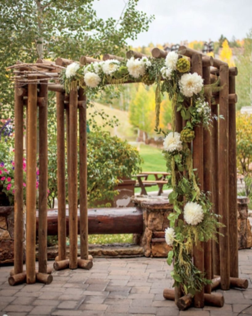 The hand-hewn timber structure frames the view with quiet strength, its wildflower garland of creamy dahlias, mossy greens, and white sprays softening the wood with tender elegance. It’s a blend of rugged charm and botanical grace—perfect for the couple who finds poetry in pine needles and promises.