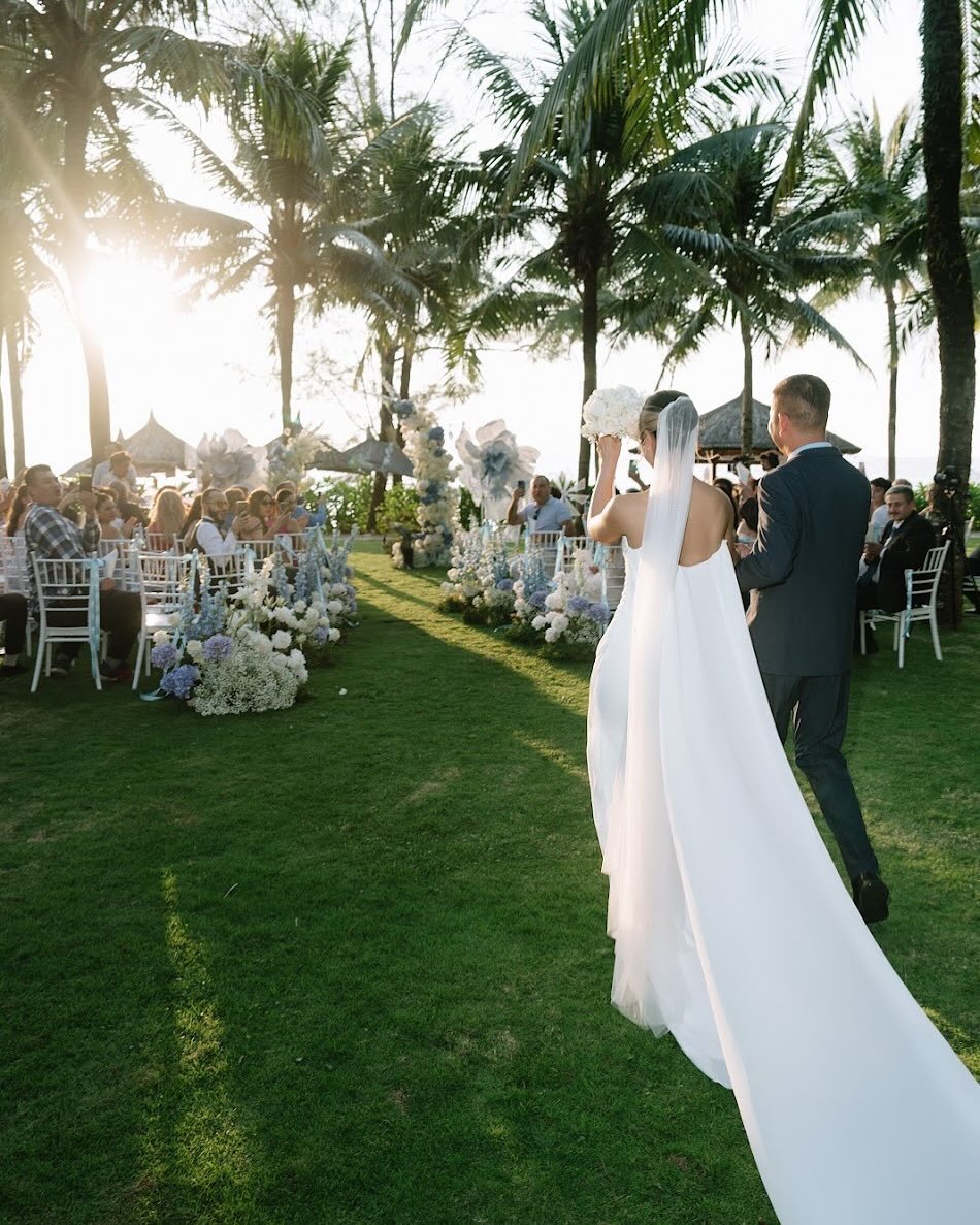 This aisle moment? Straight out of a tropical daydream. With sunlight filtering through the palms and a sea of soft blue and white florals lining the path, it’s the kind of setting that makes your heart skip (even before the vows).