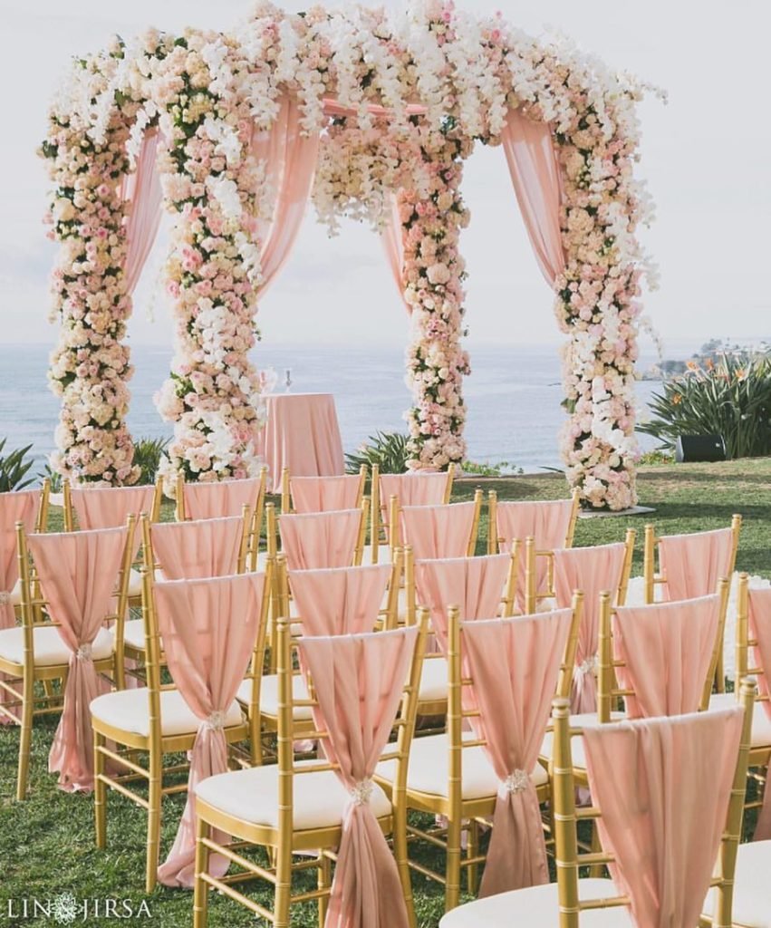 Rows of gold chairs, each tied with a rose-hued sash, reflect sunlight like champagne—elegant, yet inviting. It’s a setting that whispers romance, as if every detail was touched by love and a little bit of salt-kissed magic.