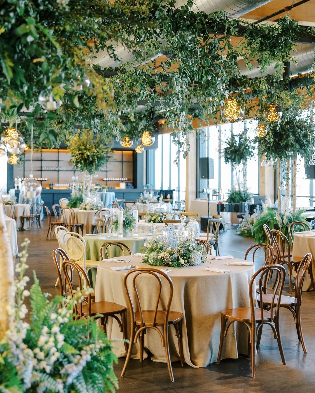 This dreamy setup feels like walking into an enchanted greenhouse—only it’s floating somewhere above the city. Cascading greenery from the ceiling creates a natural canopy, while delicate white blooms and candlelit tables bring soft romance to the scene.