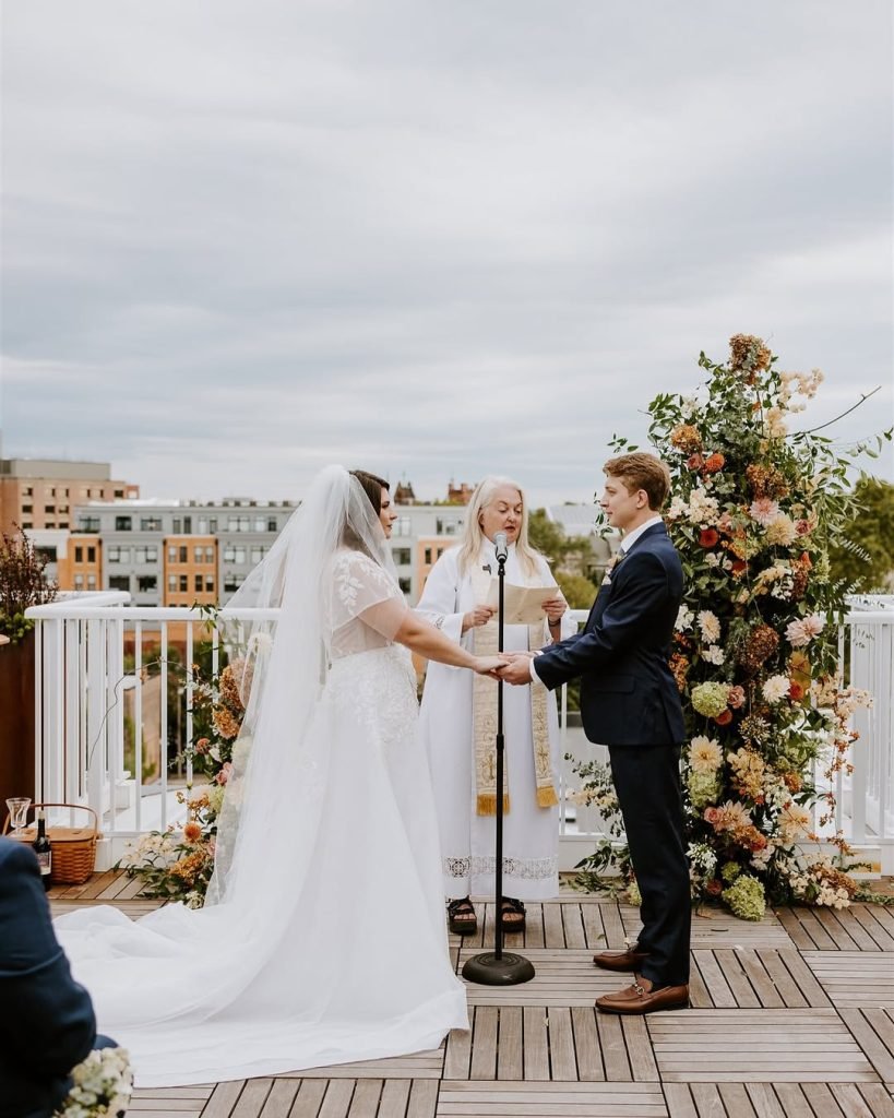 This ceremony scene balances modern lines with organic romance. Wispy florals in peach, rust, and creamy ivory climb effortlessly around the railing, as if nature herself wanted a front-row seat. The wood-paneled platform adds earthy grounding, while the skyline backdrop whispers urban magic—refined yet real.