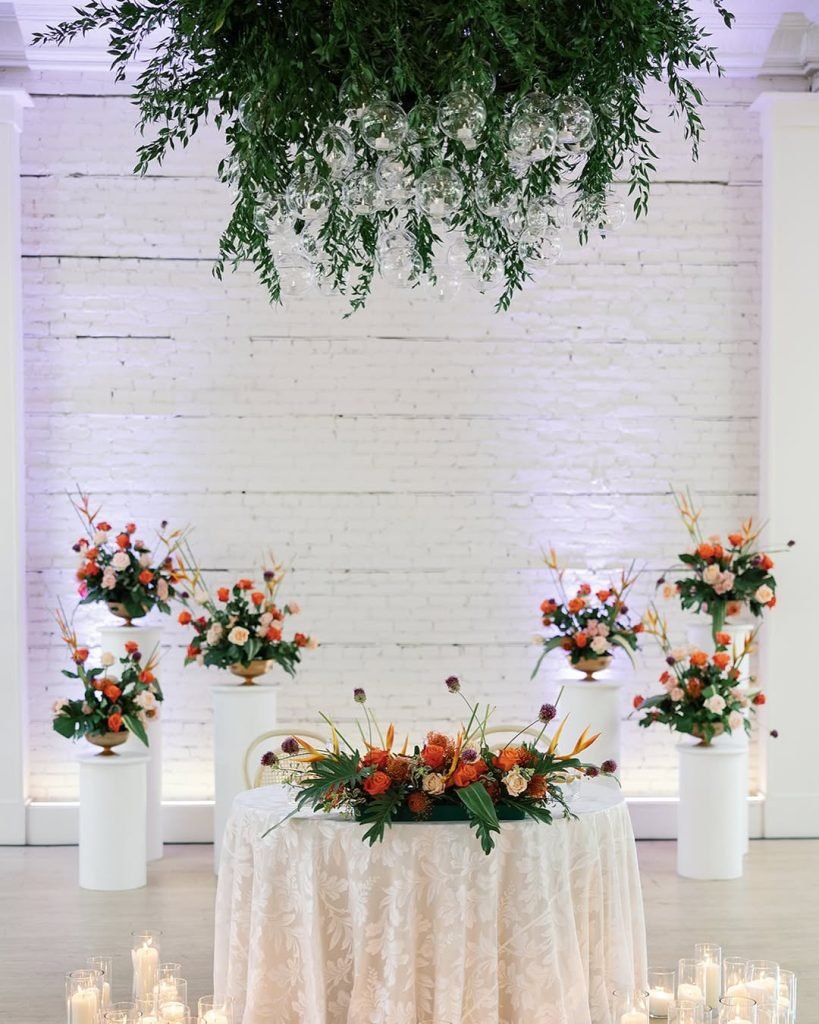 A wash of white brick creates the perfect gallery-like canvas for fiery florals to pop. Think birds of paradise, flame-tipped roses, and coral blooms bursting from sleek pedestal arrangements like tropical fireworks. Overhead, a lush greenery chandelier drips with glass orbs, catching candlelight like raindrops at golden hour.