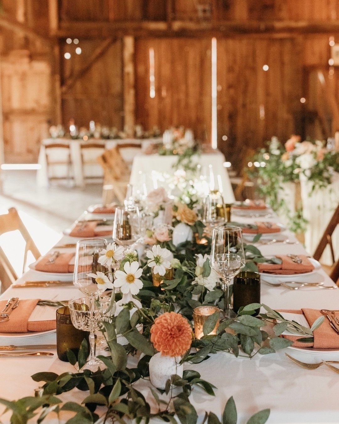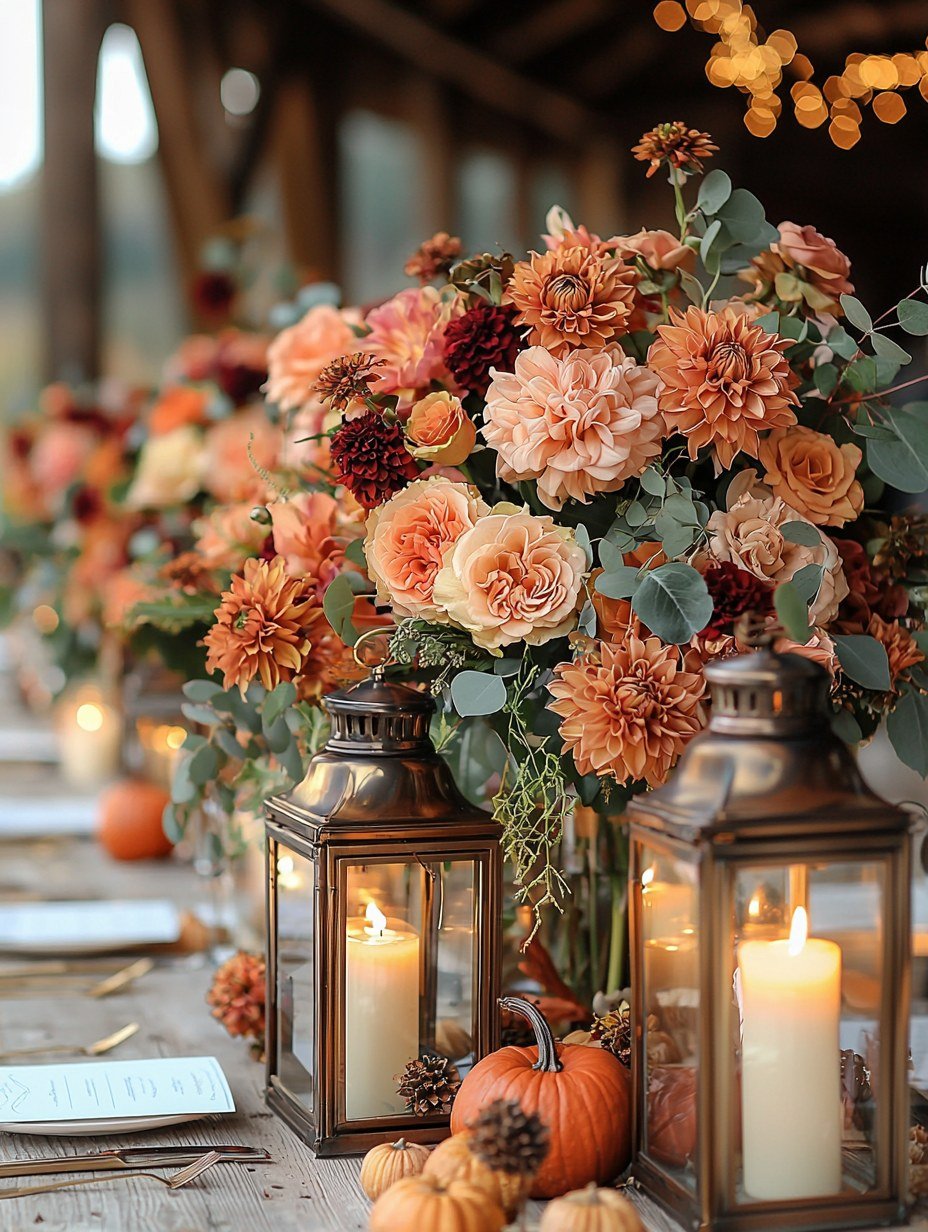 This one’s for the fall lovers. Imagine a rustic barn setting, amber-colored lanterns, pumpkins on the table, and dahlias that steal the show. The mix of deep oranges and burgundy gives off that warm, cozy feeling while still feeling totally chic.